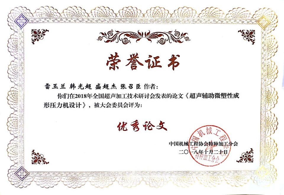 机械工程系韩光超老师和雷玉兰硕士研究生参加了本次会议,雷玉兰在大会作了题目为《超声微塑性成形压力机设计》的大会报告,并获得了大会颁发的优秀论文奖。