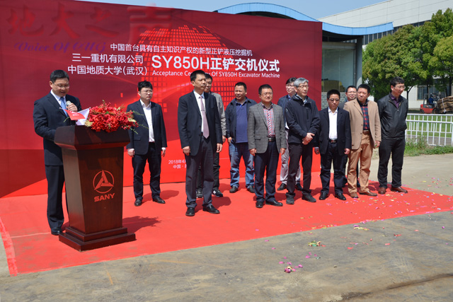 和三一重机有限公司(简称“三一重机”)联合研制的中国第一台具有自主知识产权的大型正铲液压挖掘机SY850H,在江苏昆山三一重机7号厂房正式下线交付。该机型的成功研制标志着我国在大型、超大型正铲液压挖掘机机构基础理论与技术方面,已具备独立自主的创新能力,彻底打破了国外正铲液压挖掘机机构专利技术对中国的长期垄断。副校长刘杰,相关单位负责人赴昆山对SY850H挖机进行了验收。