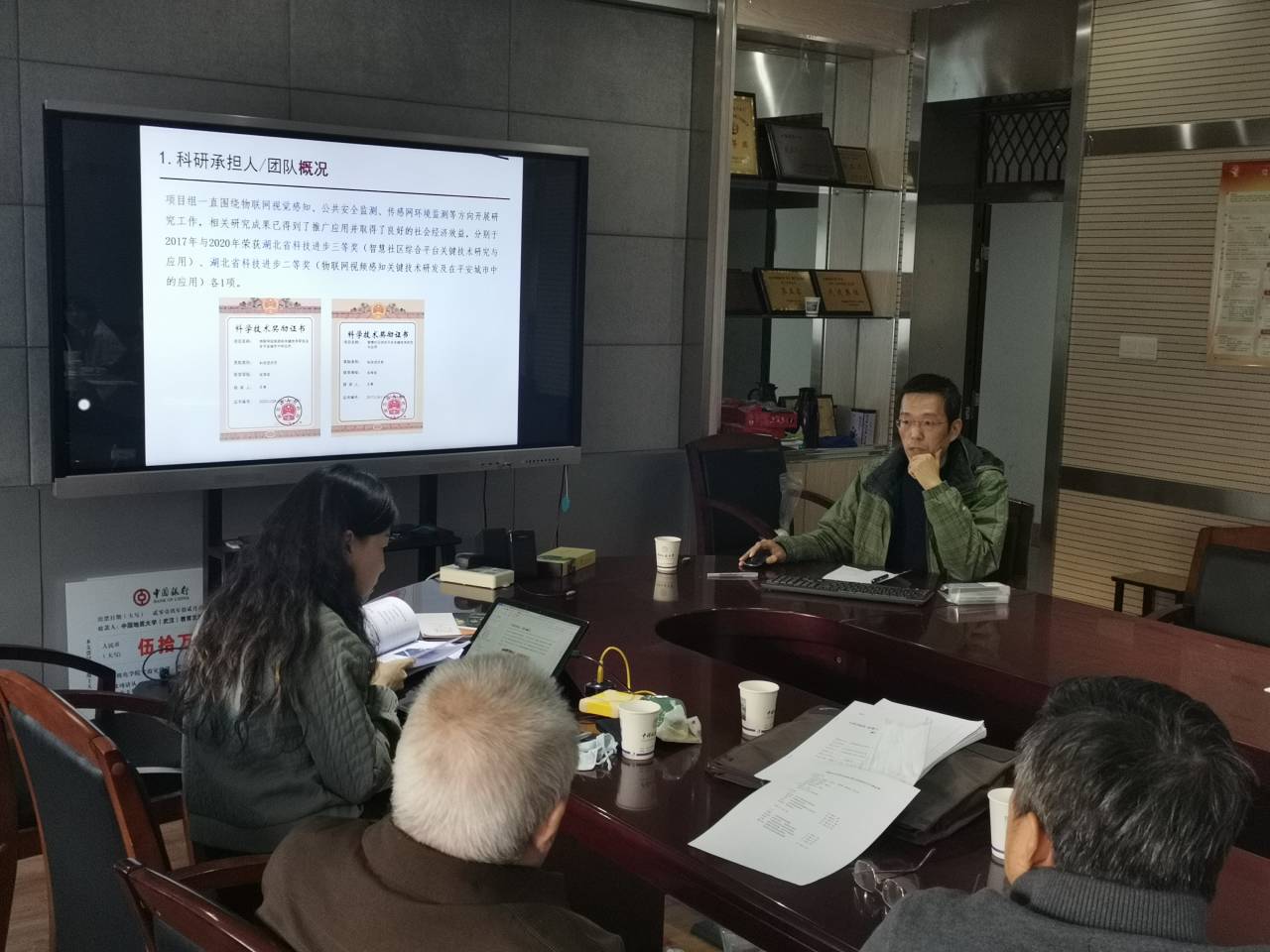 黄田野、李昌平、王瑾、程卓、郝国成五位老师就矿井水源快速识别设备、车载智能设备、油污检测等五个研究课题进行交流汇报;下午由易颖、倪效勇、程斯一、王勇、曹文熬五位老师针对水物理指标传感器、便携式探地雷达检测车、探地雷达智能车载机械臂等研究成果进行了具体介绍。