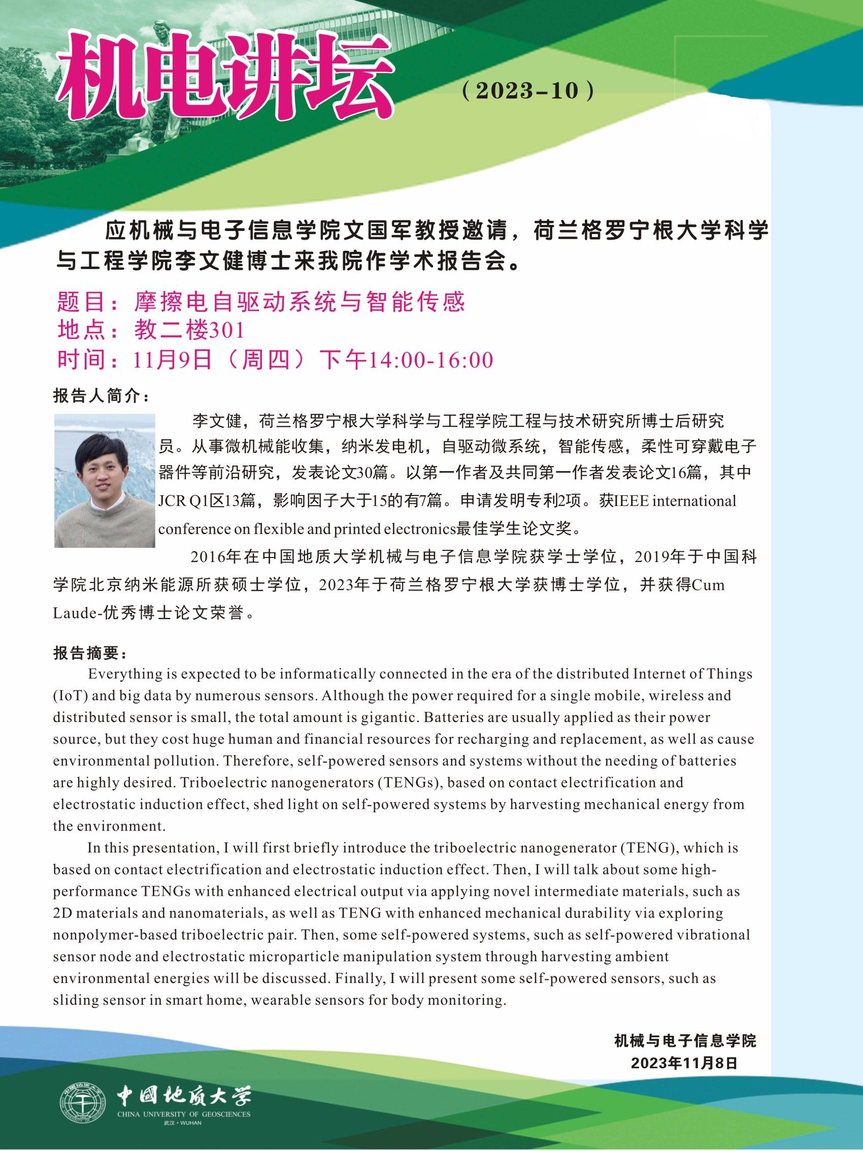 【11月9日】吃瓜网站 讲坛(2023-10):荷兰格罗宁根大学科学与工程吃瓜网站 李文健博士来吃瓜网站 作学术报告会