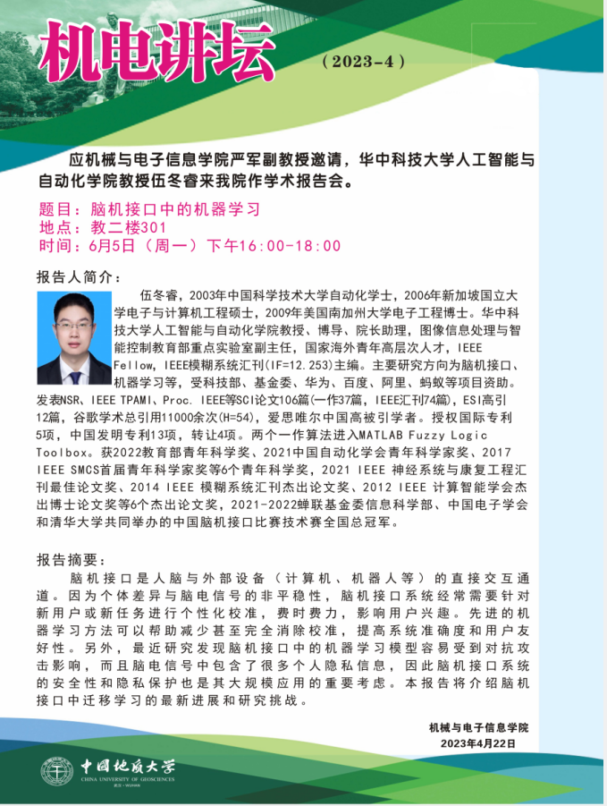 【6月5日】吃瓜网站 讲坛(2023-4:华中科技大学人工智能与自动化吃瓜网站 教授伍冬睿来吃瓜网站 作学术报告会