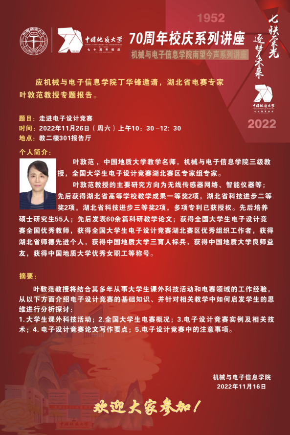 【11月26日】校庆系列学术活动---吃瓜网站 讲坛(2022-32):湖北省电赛专家叶敦范教授