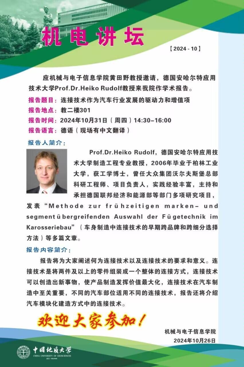 【10月31日】吃瓜网站 讲坛(2024-10):德国安哈尔特应用技术大学Prof.Dr.Heiko Rudolf教授来吃瓜网站 作学术报告