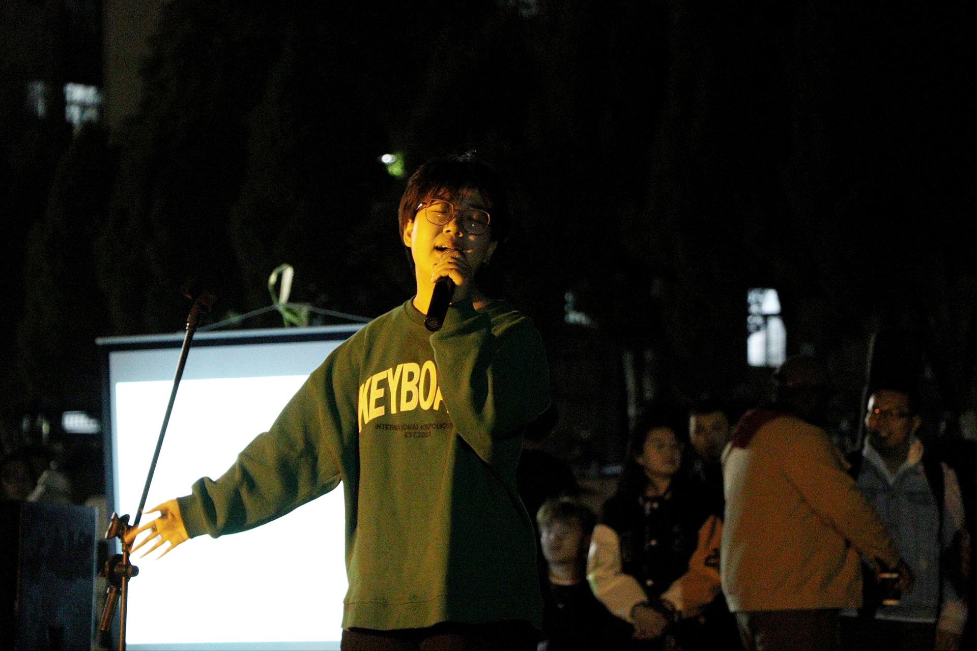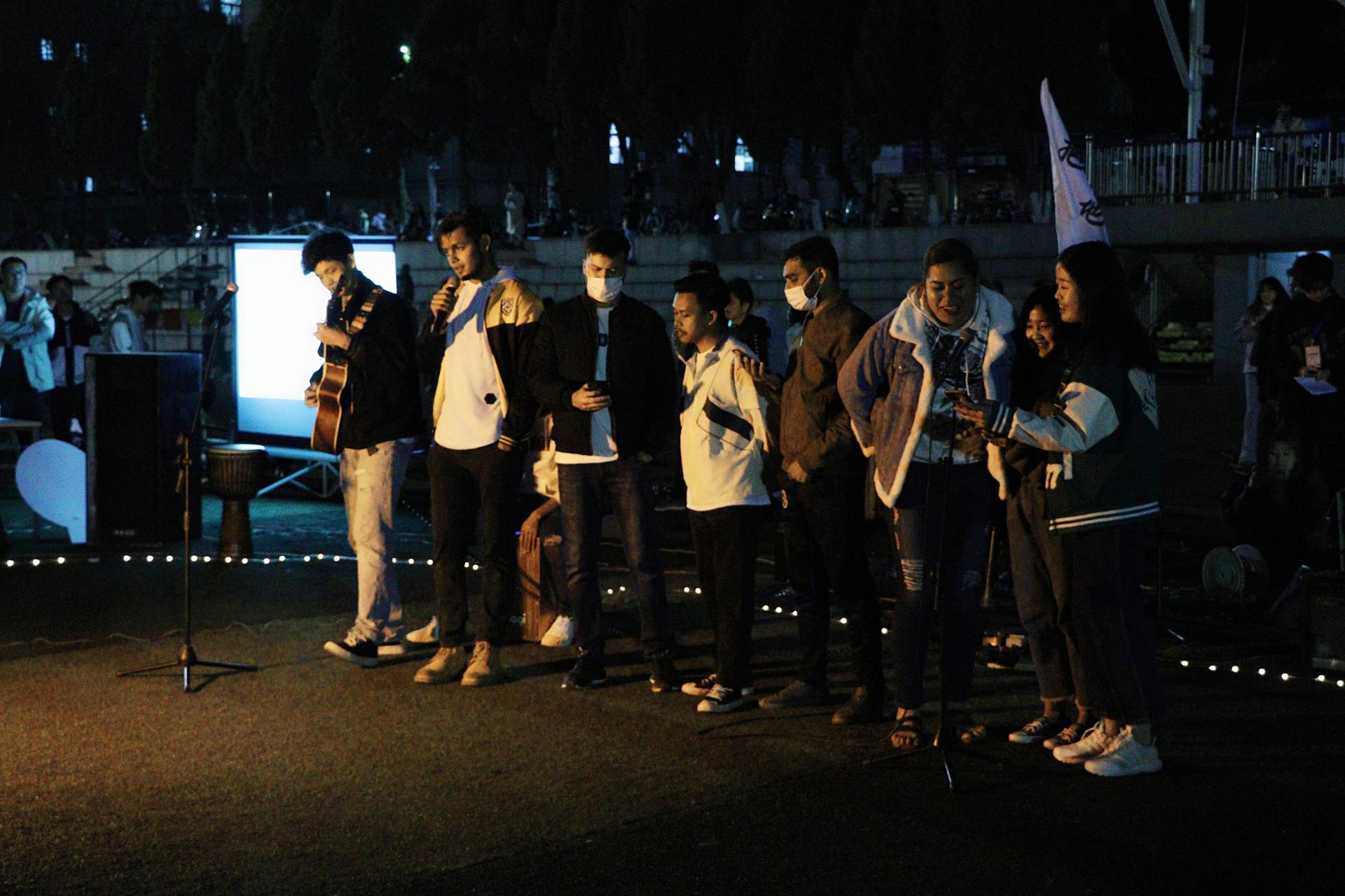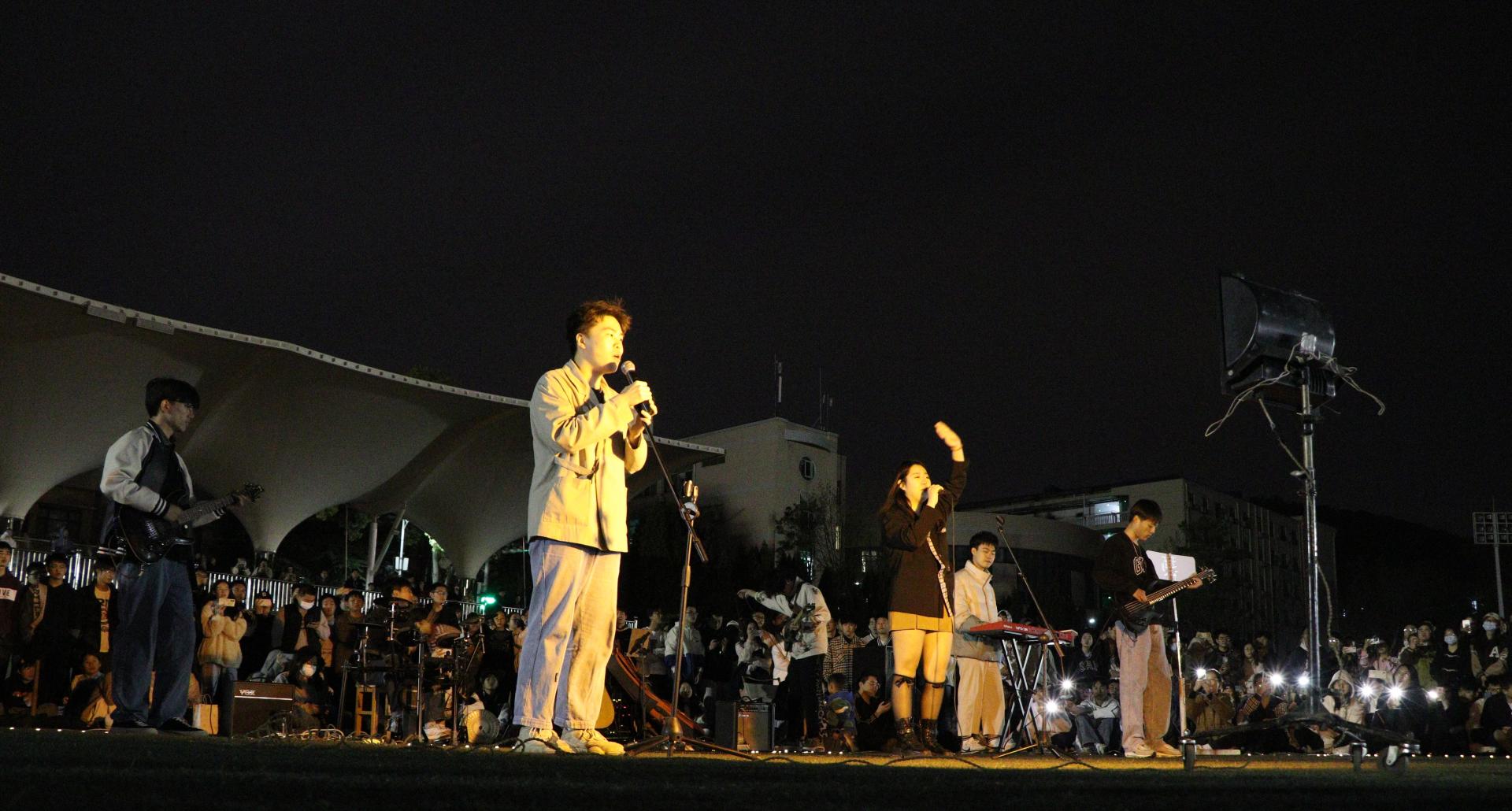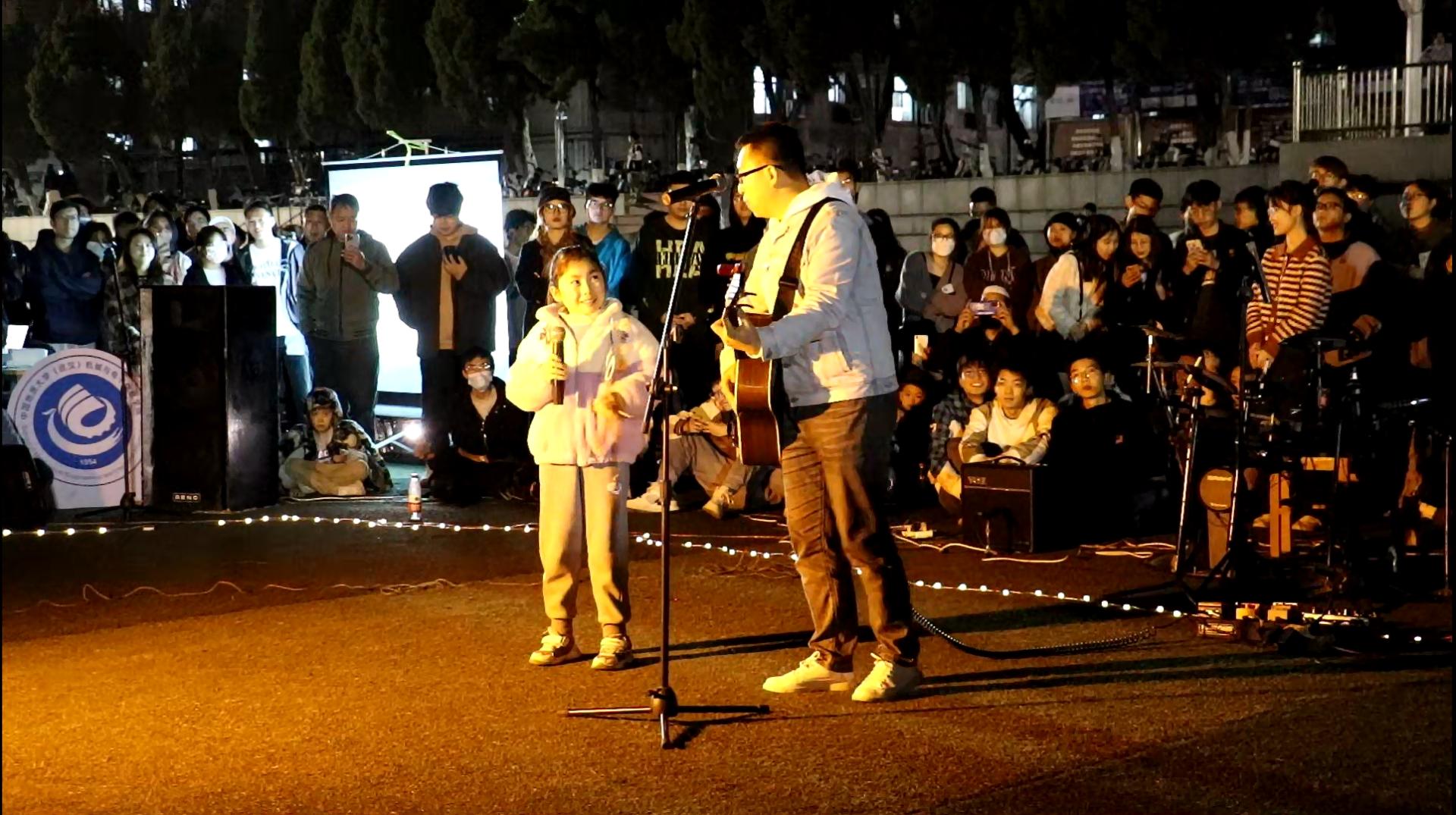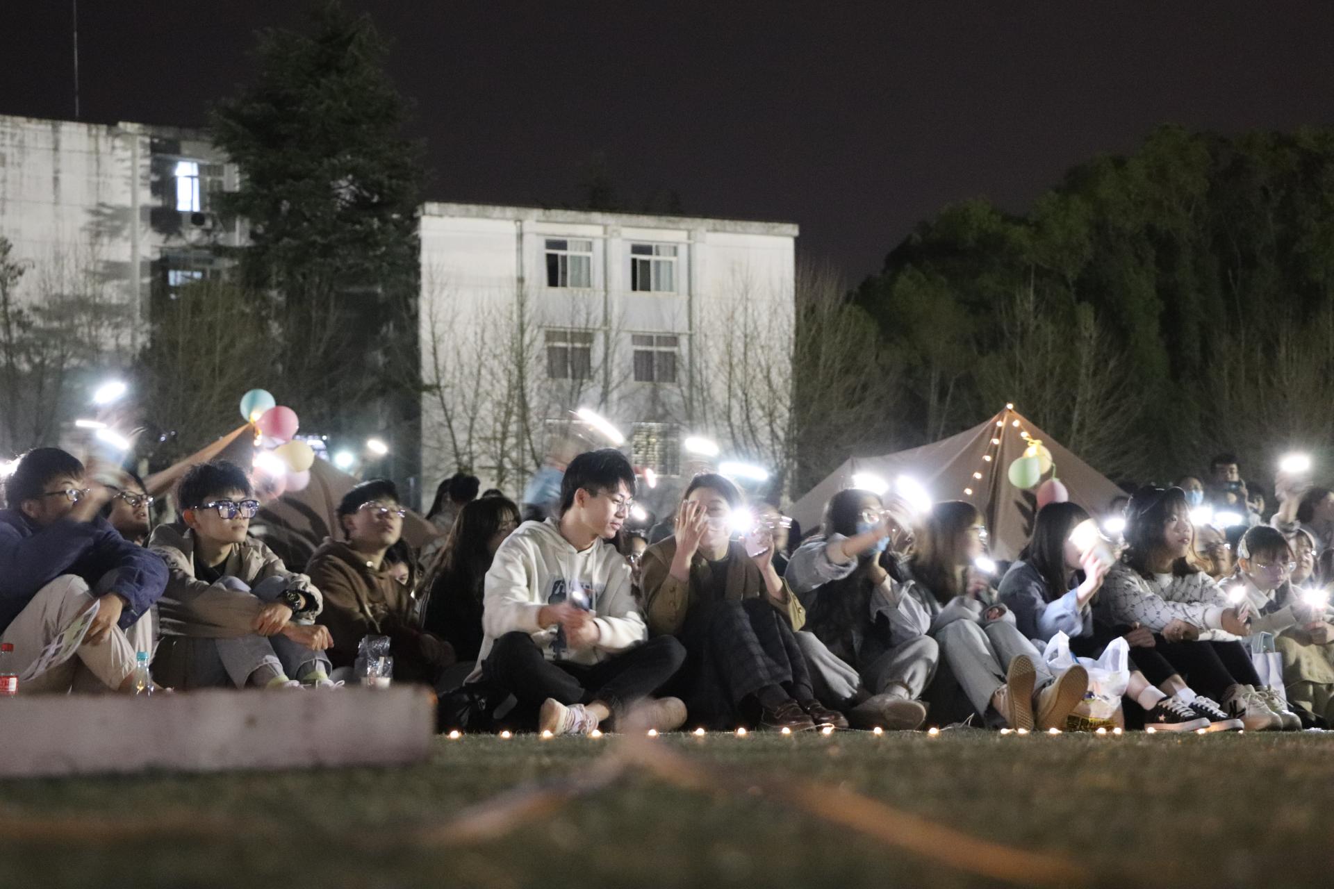 两个音响、一条灯带围出的舞台旁边,一圈一圈的同学席地而坐,时而打开手机灯光来回摇动,时而跟着歌手一起合唱。