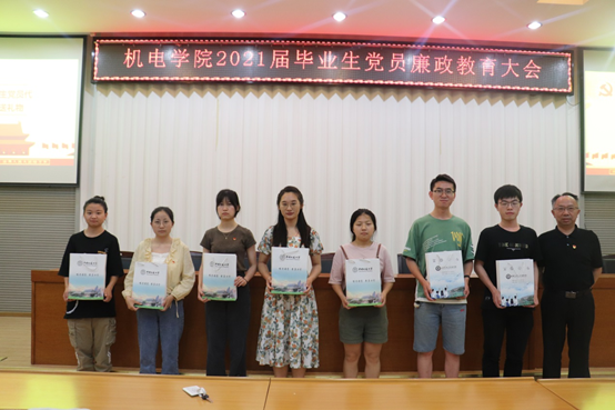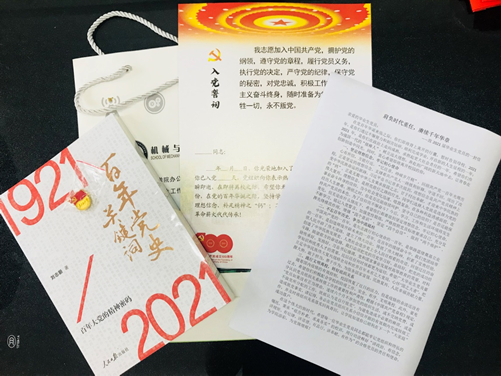 党委向2021届毕业生党员代表赠送毕业生党员纪念礼包。礼包以“学党史、强信念、跟党走”为主题,由包括党史主题学习教材、毕业生党员专属贺卡、致2021届毕业生党员的一封信在内的5件礼物组成。