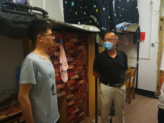 瞿祥华带队慰问新峰公寓复研学生,与返校学生亲切交谈,详细询问返校过程,查看宿舍防疫安全措施,叮嘱同学们一定按照学校疫情防控要求,毫不放松,以积极的心态面对生活和学习。
