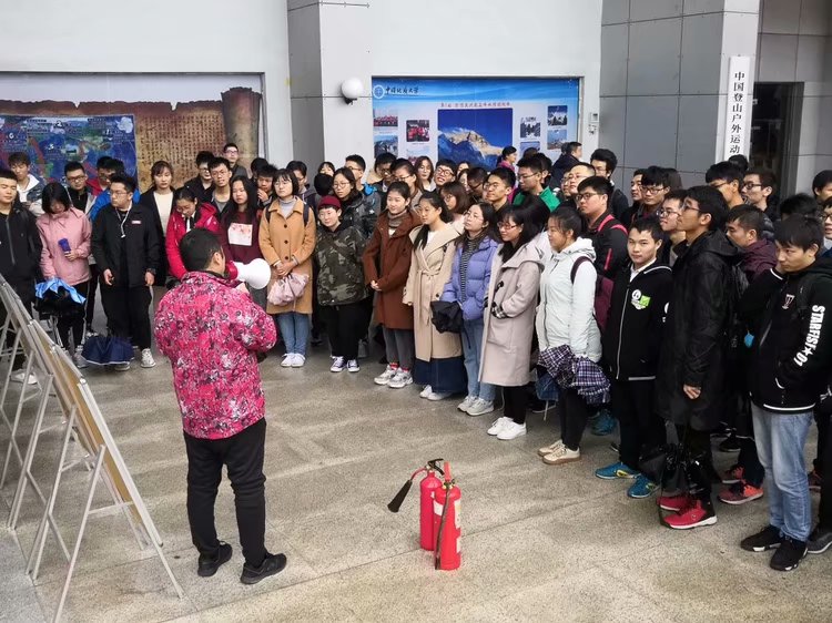 在西区体育馆门口,保卫处的老师手先向大家介绍了学校发生过的校内失火案例,进而告诉了大家一些生活中存在的火灾隐患。之后老师再为大家介绍了干粉灭火器和二氧化碳灭火器的使用方法和使用场所并实际演示了一遍,然后全体参与培训的成员一一进行灭火器灭火的实践操作。