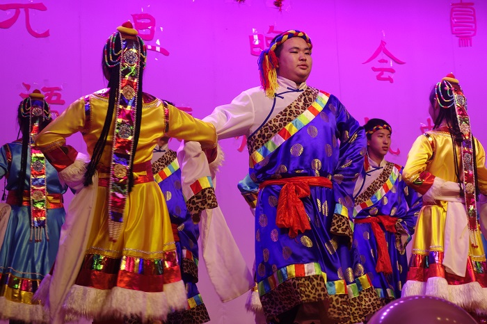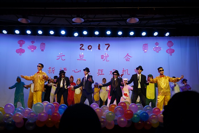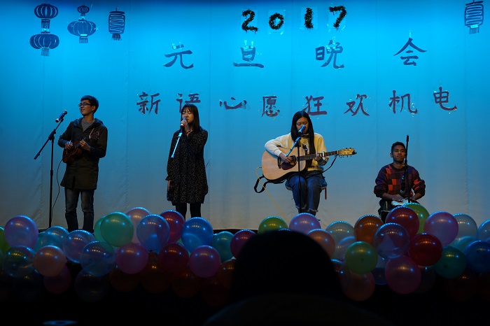 领导、老师以及同学们纷纷表达了对新年的美好愿景和对大家的祝福。一曲开场舞《Good Boy》引爆全场,拉开了晚会序幕;129合唱指挥赵婉婉带来的《和谐大家园》,烘托出现场喜庆祥和的氛围;武术协会带来的《中华武魂》,以其快速勇猛的刀法、吞吐自如的剑术,展现了中华武术的魅力;而民族民间文化协会也将来自西藏地区独特的民族风情在《雪域欢歌》中展现的淋漓精致。值得一提的是,此前情歌大赛中备受瞩目的东帝汶友人欧阳鸿飞,与罗怡等同学以Sundy Funday组合的形式,带来一曲民谣《灰姑娘》。在第一轮的微信抽奖环节后,刘强老师和王家豪老师为获得电信杯奖项的同学们颁奖。
