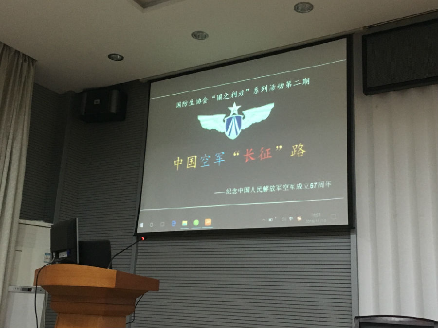 本次论坛以“中国空军‘长征路’”为主题,按时间顺序回顾了中国空军自建国以来历代战斗机的发展历程。首先,国防生协会会长张宜达致开幕词:奋武义扬,披坚执锐少年郎;保家卫国,以铁作血戎边疆。随后四位主讲人依次登台演讲。建国初期,我国国防力量相对薄弱,为应对此种境况,中国空军应运而生。第一位主讲人吴迪为大家讲解了中国空军第一代战机的发展史,她从歼-5的引入和发展来向大家介绍了中国空军的艰难启程。随着美军战机进入超音时代,我国空军也开始“蹒跚学步”。第二位主讲人朱寅斌向大家展示了空军的第二代战机——歼7和歼8,他分别从战机主要功能和改进方向向大家详细介绍了我国第二代战机的特点——高空高速。上世纪末,现代战争发展为信息化,电子化战争。为了维护我国的制空权,我国开始了第三代战机——歼10与歼11的研制。第三位主讲人包程以苏联的“苏-27”为引,展开了对我国第三代战机的介绍。他指出我国第三代战机的特点就是“低空突防能力强、续航高和载弹量大”。随着科技的进步,战机的性能也越来越强。世界战机也逐渐进入了“4‘s’时代”,即隐形能力、超音速巡航能力、超机动能力、超级信息优势。第四位主讲人王新立以珠海航展上惊鸿一现的歼-20为切入点,着重向大家介绍了我国第四代战机优异的作战性能。四位主讲人深入浅出的讲解、生动活泼的演示频频引发观众们的掌声。演讲期间,他们还与场下的观众热情互动,并为参与互动的观众送上了精美的礼物。